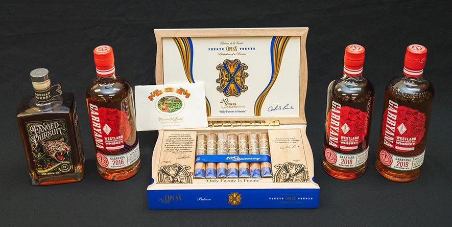 Indulge in a premier whiskey and fine cigar collection featuring a once-in-a-lifetime Kentucky bourbon, highly sought-after Garryana releases from Westland Distillery, and a humidor box of premium Opus X 20th Anniversary cigars.