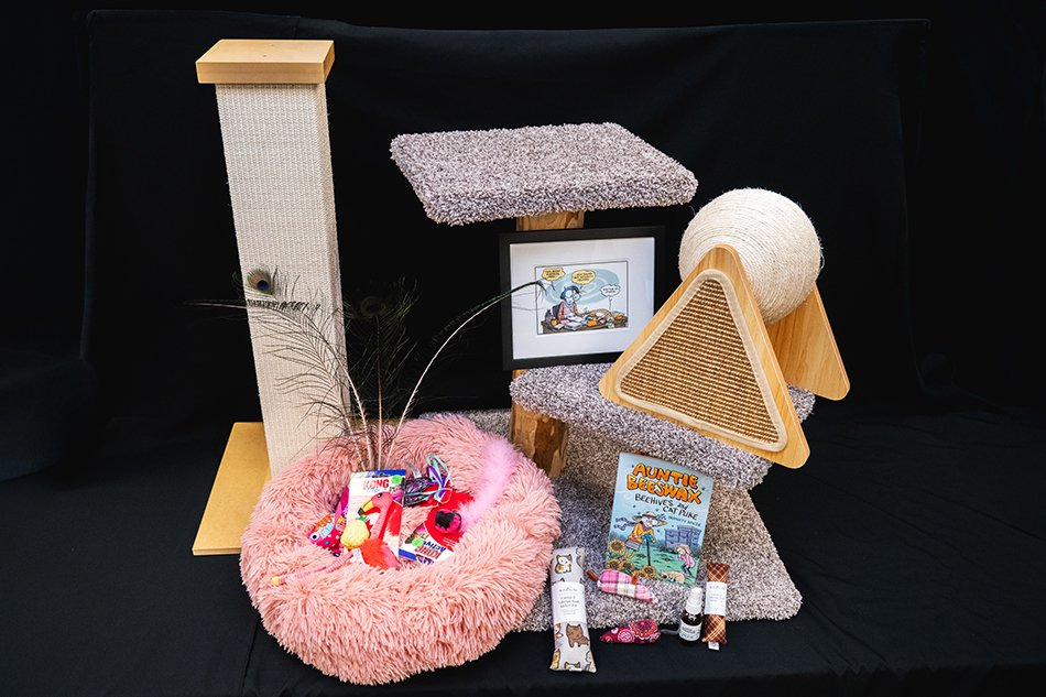 Plus, you get the popular six in-home nail trim visits by FCCO founding veterinarian, Dr. Ellie Shelburne. And, rounding out the experience, are two distinctive works by Bridget Spicer, creator and artist of the Auntie Beeswax Comic, adding a playful, cat-inspired artistic twist to your home. It’s a purrfectly Purrtty in Pink curated package for cats who expect nothing less than the totally rad treatment.