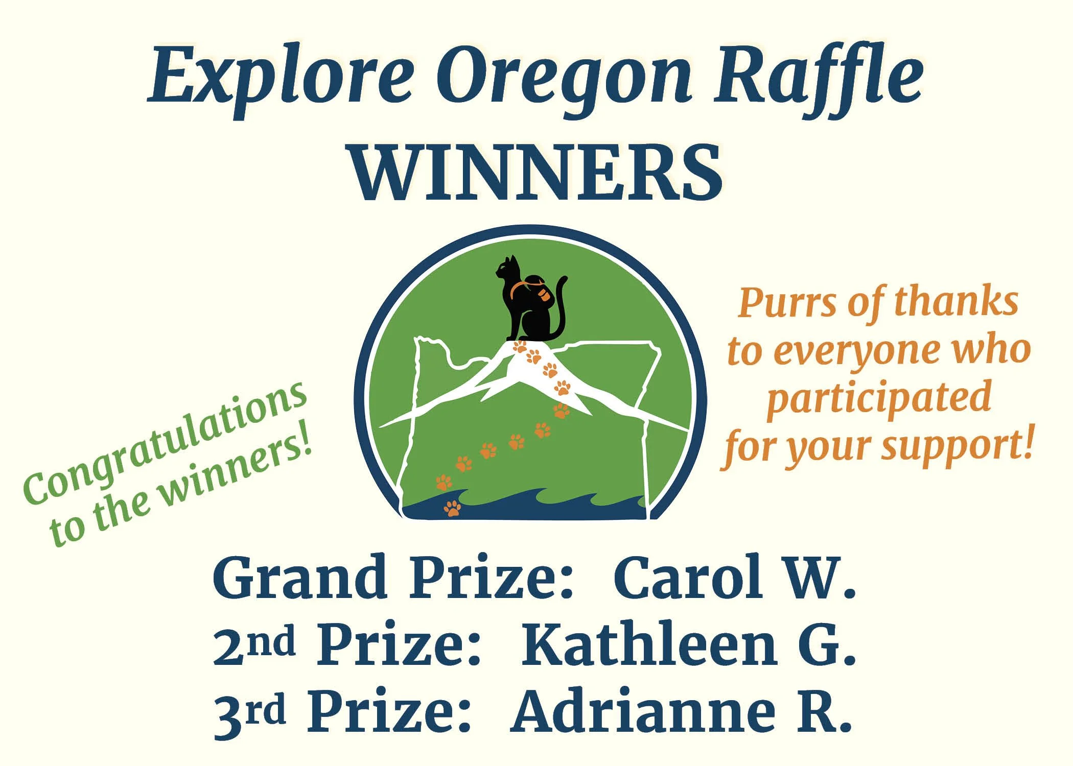 Prizes must be picked up at the Feral Cat Coalition of Oregon (4522 S Water Ave, Portland, OR).